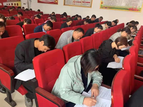 此次测试采取闭卷考试,内容涵盖主题教育、十九大精神、基层党建等方面的知识。测试现场,全体参与人员态度端正、独立思考、认真答题。