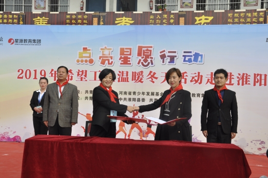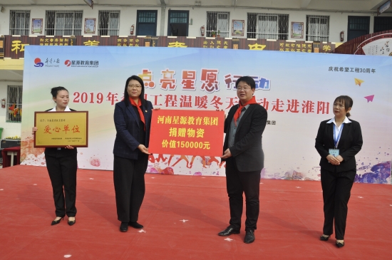 11月8日,由共青团河南省委、河南省青少年发展基金会、河南星源教育集团主办,共青团周口市委、中共淮阳县委、共青团淮阳县委承办的庆祝希望工程30周年“点亮星愿行动”2019年希望工程温暖冬天活动走进淮阳在淮阳县城关镇北关学校隆重举行。