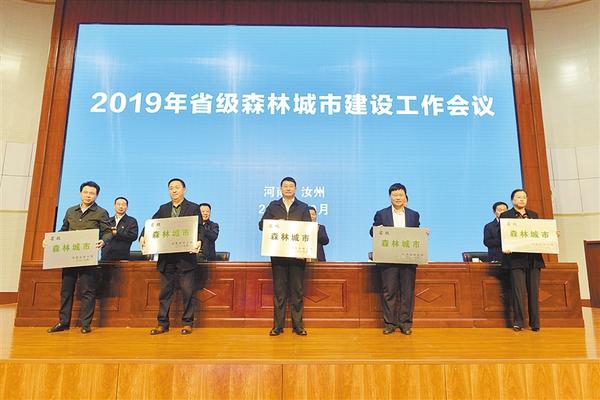 本报讯 (记者 李瑞才 文/图) 廊道绿化、村镇绿化连片成方,田园生态宜人,纵横交错的道路两侧绿树葱茏;蜿蜒流淌的涡河、惠济河两岸绿意盎然,荣膺省级、国家级湿地公园;绕城或穿城而过的“五河”被绿色染就,三季有花,四季常青,与镶嵌在河边的游园、亭廊步道相得益彰,成为人们休闲游憩的好去处……10月30日,记者从2019年全省森林城市建设工作会议上了解到,我省公布的首批15家省级森林城市名单上,老子故里鹿邑县榜上有名,成为我市唯一获此殊荣的县城(如图)。鹿邑县委书记梁建松,县委常委、县政府党组成员张国庆参加会议,并代表鹿邑在现场接受颁奖。