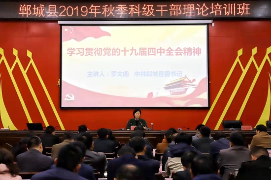 11月19日,中共郸城县委书记罗文阁以《学习贯彻党的十九届四中全会精神》为题,为县委党校2019年秋季科级干部理论培训班上专题党课。县委副书记、政法委书记、县委党校校长崔卫国主持。