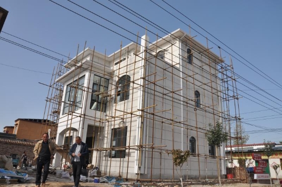 11月20日,在全国文明村——商水县巴村镇上城村,村民朱云山家的3层轻钢别墅正在建造中。这是该村第一幢新式别墅,全框架结构,造型别致,没有使用砂石、水泥、砖瓦等,全部使用新型环保建材,建造过程就像搭积木一样,并具有节能环保、防风抗震、隔音防火、造价低廉、建造快等特点,很受喜欢。图为附近村民前来参观。记者 付永奇 摄
