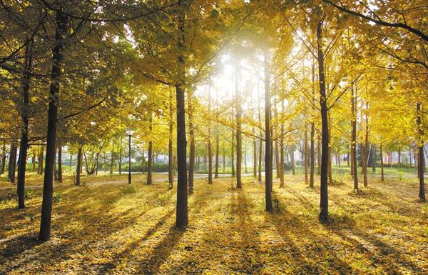 近日,周口市经济开发区人民广场,金黄色的杨树叶在阳光照耀下熠熠生辉,给城市增添一抹亮色。张振海 摄