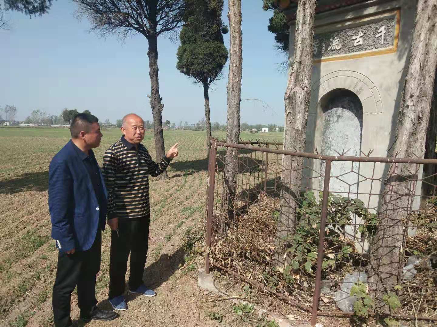 行走在卢庄村北一片空旷的田野上,抬眼望去,几棵苍翠的松柏傲然屹立于黄土地中间,松柏掩映之下的一个不起眼的土堆就是卢子美的长眠之地。