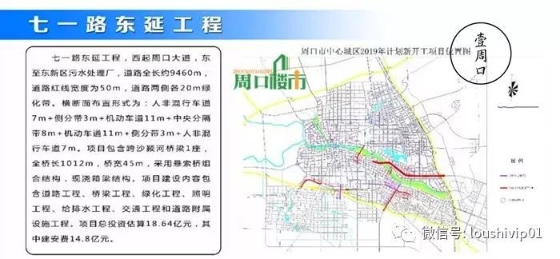 资料显示,七一路东延项目为我市重点工程,该项目周口市七一路东延至武盛大道工程,道路全长约5546米。其中:红旗二路至周口大道段有现状道路,为提升改造项目,长度约1366米,道路红线宽度由现状42米拓宽至47米;周口大道至武盛大道段为新建工程,长度约4180米,道路红线宽度50米,跨河桥一座(全长约500米)。
