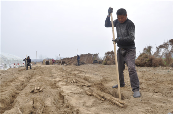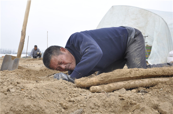 11月26日,沈丘县白集镇40多岁的耿金中与另外两个同伴一起来到周口城乡一体化示范区许湾乡肖王庄,未来的一段时间,他们吃住都将在这里进行,直到将这一区域的山药挖完。耿金中说,他挖山药已经有20多年了,20多年前,沈丘县大规模种植山药,每到收获时,会有很多山东挖山药工人来这里挖山药。他看到这个行当能赚钱,就开始学挖山药技术。此后的多年,他先后到山西、湖北、安徽等地挖山药。