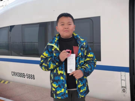 “没事,不急,我和妈妈一起等俺爸来接。”小朋友拿着自己的高铁票,让记者给他拍照留下这次快乐的记忆。