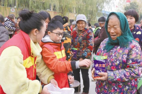 12月1日上午,太康县好人协会联合爱心企业来到太康县芝麻洼乡三所楼小学,为该校学生及家长送来价值近5000元的学习用品和体育用品,以及价值1.2万元的肥料。此外,他们还组织学生开展跳绳、拔河、猜谜语和绘画等活动。图为发放肥料现场。记者 马治卫 通讯员 青俊 李丹 摄