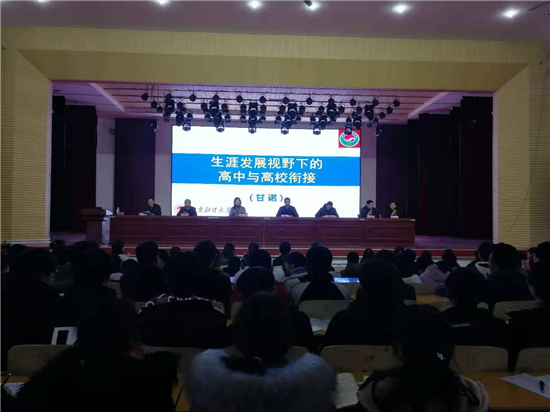 甘诺教授以“生涯教育视野下的高中和高校衔接”为题,从“职业生涯唤醒、兴趣能力与文理分科、走进象牙塔、外面的世界很精彩”四个方面做了精彩报告,并对选科依据、基本原则、高校录取及志愿填报应注意的问题进行了详细的解读,还就大学大类招生及霍兰德职业兴趣测评个性特质与大学专业分类如何匹配进行了专业分享。
