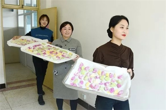 护师赵瑞本不该上班,可她一大早就起床,洗菠菜榨汁、和面,给过周日的孩子留了早饭就匆匆来到医院;护士长赵凤英一早打好馅,又榨了南瓜汁和面,带着来到了单位;护师崔文芳上夜班,她提前准备好火龙果,和成面带着,下了夜班换上衣服就干开了;护师谢梦媛孩子刚一岁多,身体不舒服,哭闹不休,也丢给妈妈照顾,匆匆赶到医院……