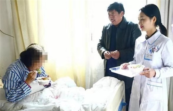 饺子煮好,盛入碗内,端入病房,亲手送到患者手中,看到患者品尝饺子时的开心样子,医护人员从心里笑到了脸上。