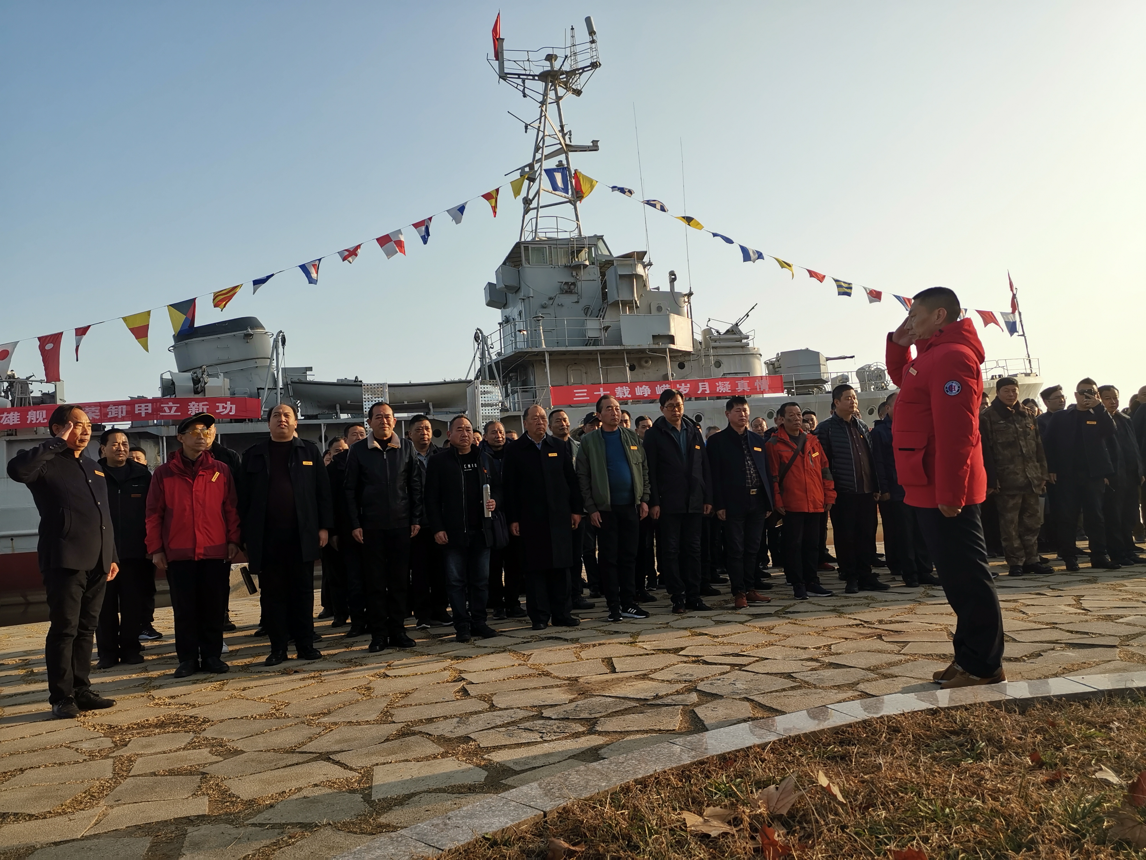 “立正,向右看齐!向前看!”当天的周口国防园内人群熙攘,冬季的阳光映照在人们的脸上柔和而温暖。军舰上,“英雄舰光荣卸甲立新功,三十载峥嵘岁月凝真情”的红色条幅格外醒目,军舰旁,来自河南、河北、湖南、湖北、江西以及新疆、广东等地的80余名海军老兵正在集结列队。
