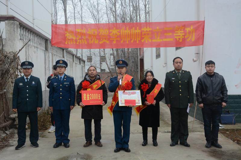 一人参军,全家光荣;一人立功,全家荣耀。2020年1月2日,沈丘县洪山镇庙山李村听说黄继光生前部队要来送喜报,荣立三等功的李帅帅一家特地选择在村口迎接这份荣誉。接过大红喜报,李帅帅的母亲喜极而泣:活了几十年了,送儿子当兵也有12余年,今天是我对“军属光荣”四个字感触最深的一次,也是最光荣的一天,沾了儿子的光了……