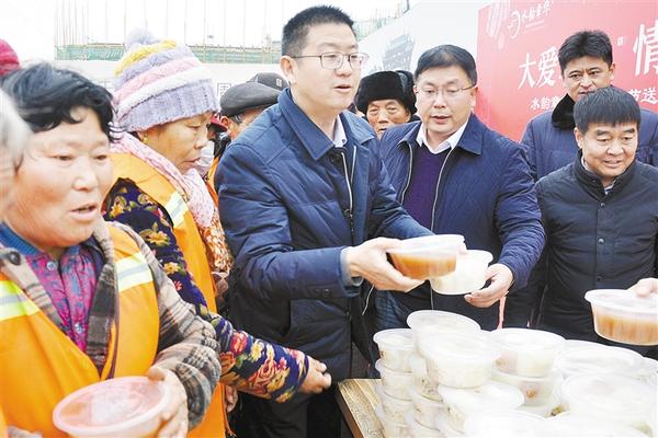 1月2日上午,商水县在城区6处人流集中的地方设立免费送粥点,1000多碗腊八粥香飘四处,温暖全城。图为腊八粥发放现场。记者 付永奇 摄
