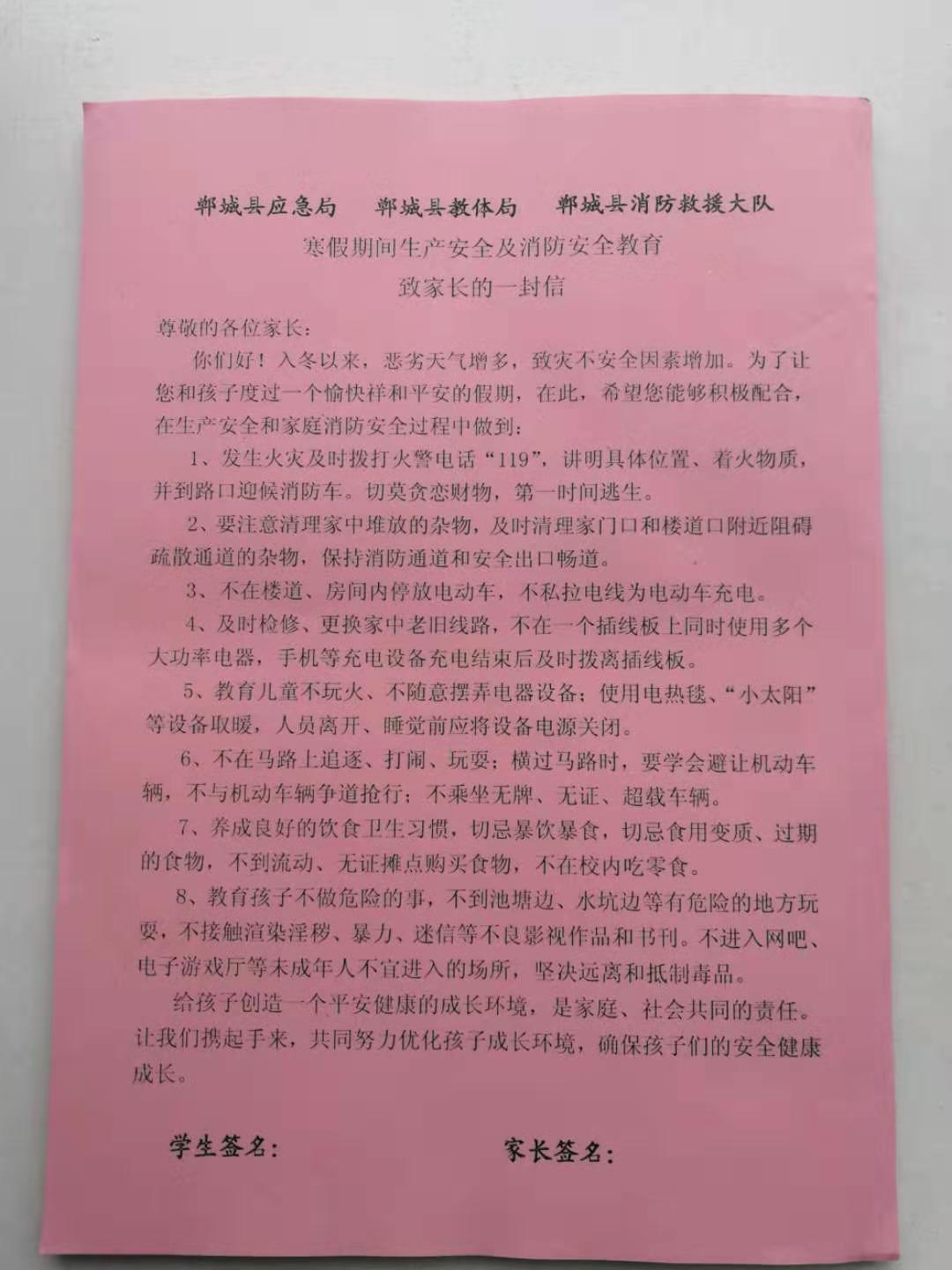 《寒假期间生产安全和消防安全教育致家长的一封信》包括正确报119火警、电动车充电、电热毯使用、保持疏散通道畅通等消防安全知识以及交通安全、食品安全、网络安全等,内容丰富,有很强的针对性。郸城县委常委、常务副县长王智华高度重视《一封信》的印制发放工作,专门召开会议要求县应急局、县教体局、县消防救援大队各司其职、密切配合,县消防救援大队牵头,挑选贴近生活、身边常见的安全及消防常识,以简洁实用、通俗易懂的语言,印制《一封信》内容;县教体局要迅速部署,确保在放假之前,把《一封信》发放到每名学生手中。为确保取得实效,县教体局、县消防救援大队还联合发文,要求《一封信》必须由家长和学生共同完成学习,学习完毕后家长和学生还要共同签名确认,假期结束后由学校统一收回报教体局存档。