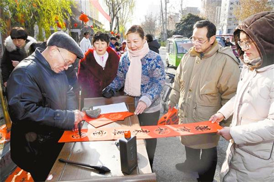 1月19日,由周口市民间文艺家协会、川汇区文联联合举办的“送万福进万家”义写春联活动,在周口华威民俗文化博物苑门前举行。来自市书协、川汇区书协的20多名书法家现场挥毫泼墨,义写春联和“福”字,受到市民的一致好评。记者 梁照曾 摄