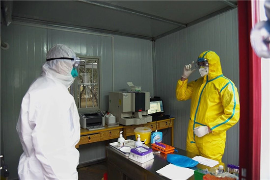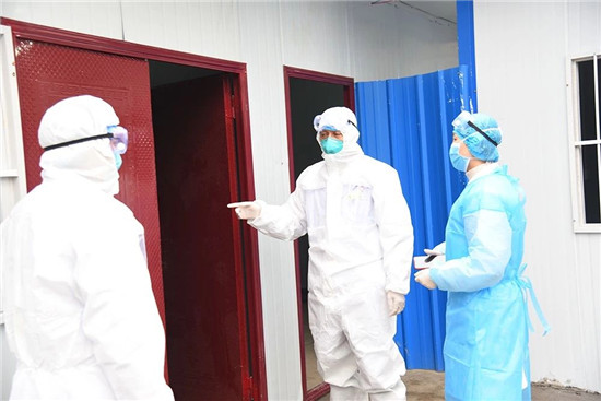 医院在附近宾馆租用25个单间,用于一线医务人员临时休息,医务人员换班时由专车接送,吃饭由专人派送,确保任何一个环节都不会发生意外感染。 于健、高飞深入隔离区慰问值班医务人员,对他们舍小家、顾大家,为防疫工作大局、为更多群众的生命与健康付出的辛苦努力,表示衷心的感谢。