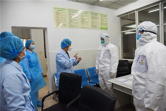 1月27日上午,郸城县人民医院院长于健、书记高飞身着隔离服深入到发热门诊隔离区、感染科隔离病房及诊室,安排部署防控工作,指出:按照控感工作要求,为防止交叉感染,从即日起,发热门诊、感染科病房、CT室、放射科、检验科等防疫一线工作人员,24小时工作在一线,直到疫情结束。