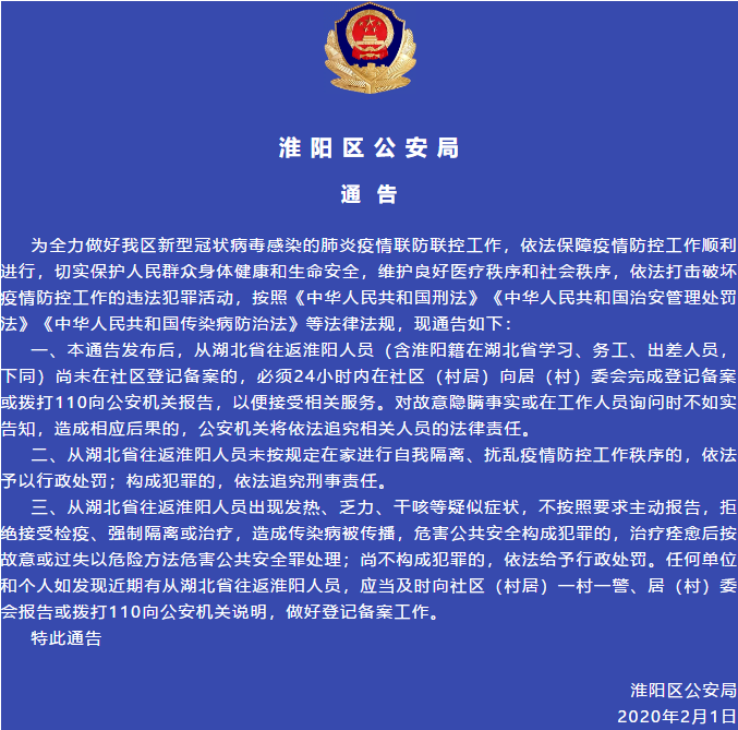 今天,淮阳区公安局发通告:从湖北返淮人员务必24小时内……