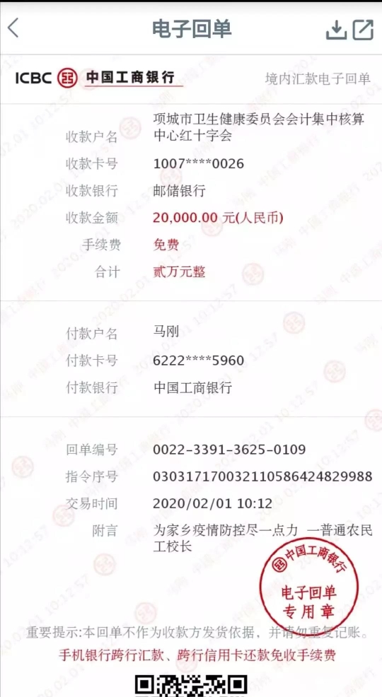 “现在是抗击疫情的关键时候,广大干群一线人员放弃节假日,冲锋在防疫一线,为项城疫情防控工作贡献力量,在此向他们表示深深的敬意。同时我也想用这种方式,尽自己一份绵薄之力,为全市抗击疫情作出我一点贡献,因能力有限捐的不多,希望能带动更多的人为家乡抗击疫情贡献自己一份力量。祝愿大家都平安健康,顺利度过这次难关,项城加油!武汉加油!祖国加油!。”马刚说。