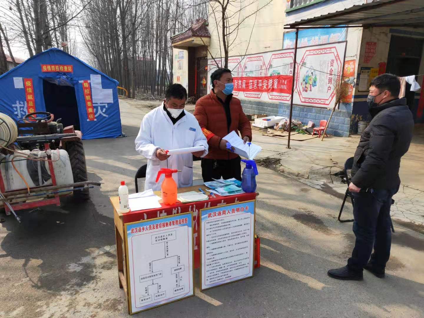 记者在该镇顺便走到几卡点看到:每个卡点都搭有帐篷,插一面党旗,有人员值守,有进出人员登记册,有消毒液,有电子温度计,张贴有告知书,悬挂有《武汉返周人员明白卡》《返乡人员及密切接触者管理流程图》等。