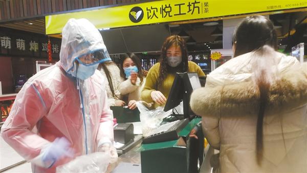 2月4日,中心城区中原路一超市内,市民在排队结账。自新型冠状病毒感染的肺炎疫情发生以来,中心城区各大超市加强防控措施,秩序井然,市民安心购物。