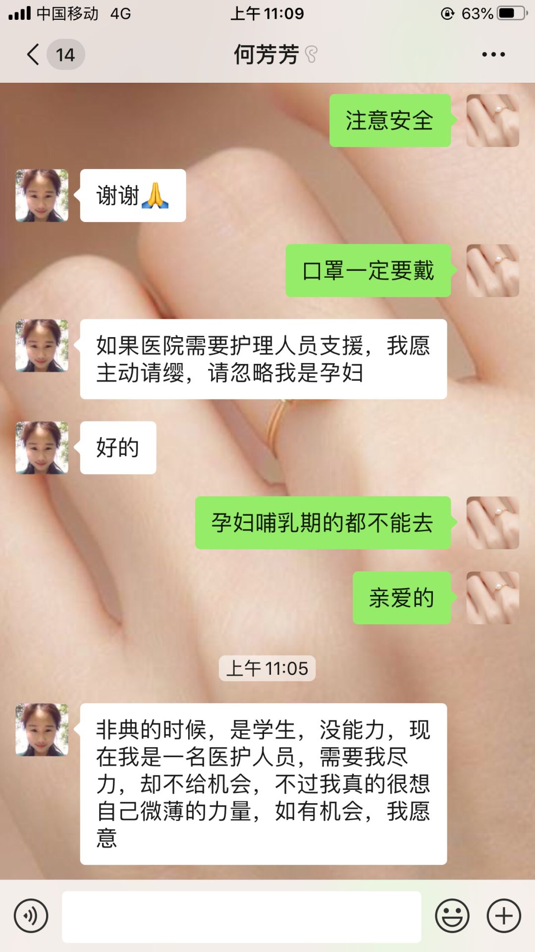 有孕在身的何芳芳向护士长请缨报名参加第二梯队替补队员,但医院规定孕妇及哺乳期护理人员不得报名到抗疫一线,令何芳芳深感遗憾:“非典的时候是学生,没能力,现在我是一名医护人员,需要我尽力却不给机会。真的很想尽自己微薄的力量,如有机会,我愿意!”