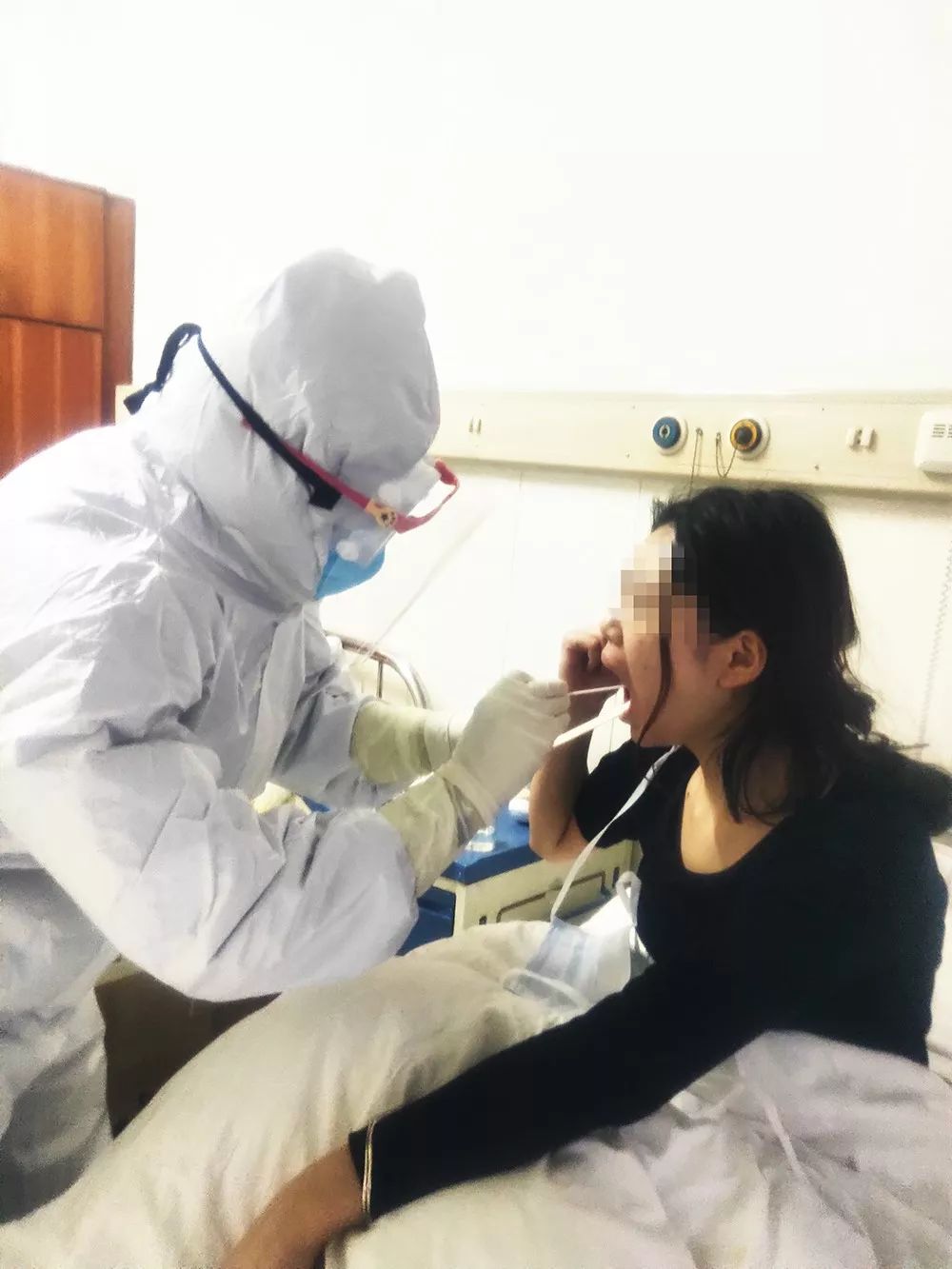 检验科胡敏在为疑似病人采集咽拭子时,为了采集准确,只好离病人更近一些,病人却示意她离远点。有时候不经意的一句话,能让感动到落泪。
