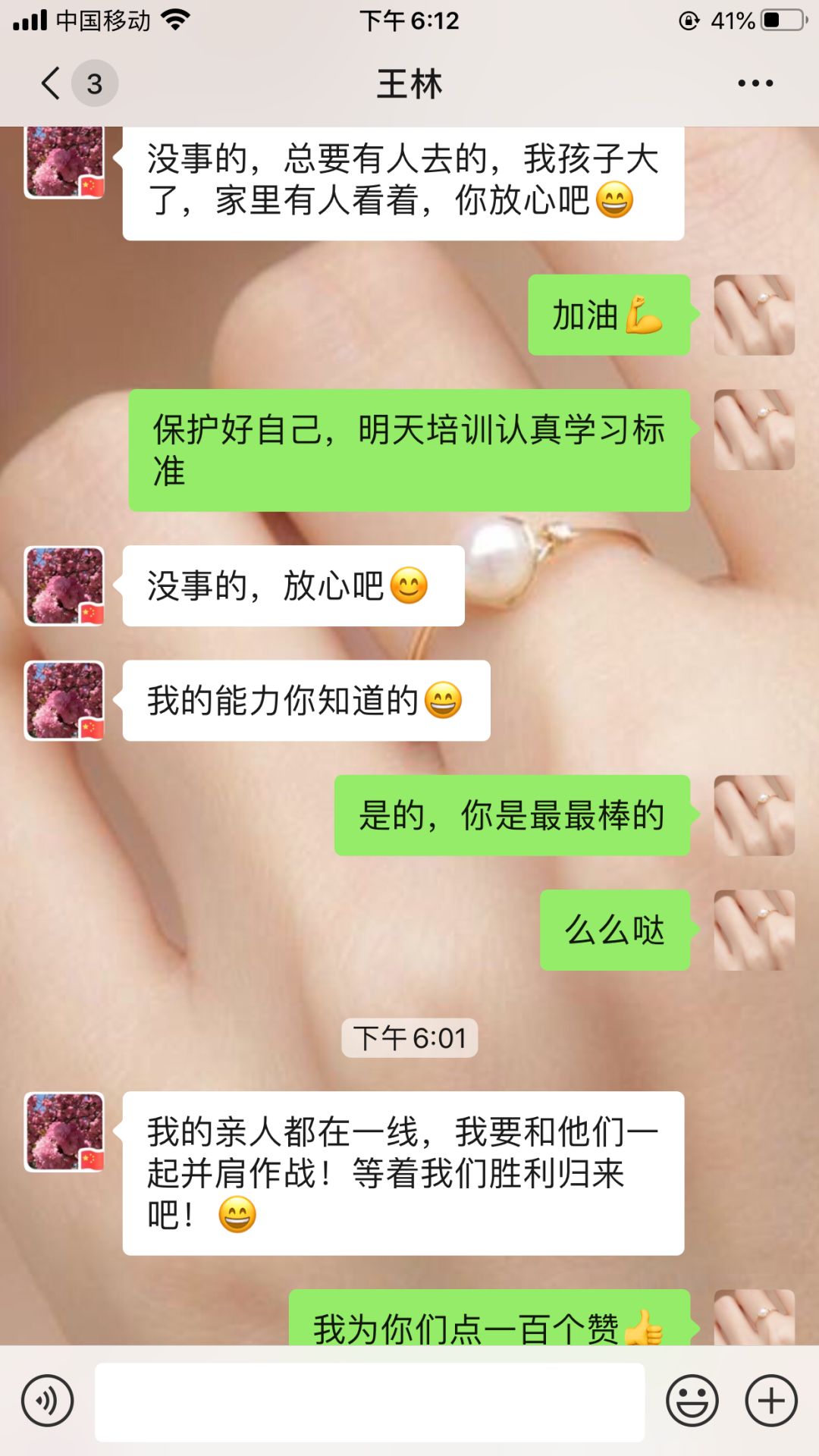 我的亲人都在前线,我要和他们一起并肩作战。