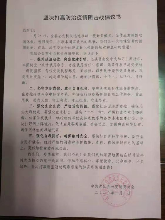 自全省启动抗击新型冠状病毒引发肺炎疫情的一级响应后,沈丘县公安机关迅速启动一级勤务模式,在这场举国同频共振的防治疫情伟大斗争中,突出战时党建引领,为坚决打赢疫情奠定了坚实的组织保障。