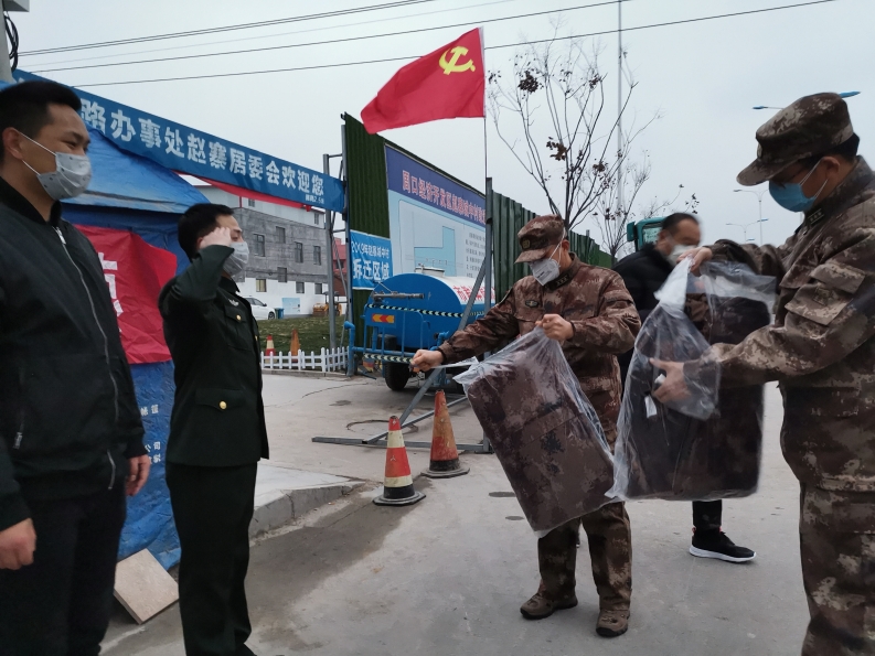 在淮河路办事处赵寨居委会执勤点,探亲在家两名现役战士赵为为、赵继周疫情发生后坚持在防控一线执勤点执勤。当晚6时许,天色渐黑,了解到这一情况后,部长和政委依然驱车赶到现场,详细了解两名战士的服役情况,并给他俩每人送了一件军用大衣,提醒注意自身安全,有啥需求第一时间和武装部沟通联系。