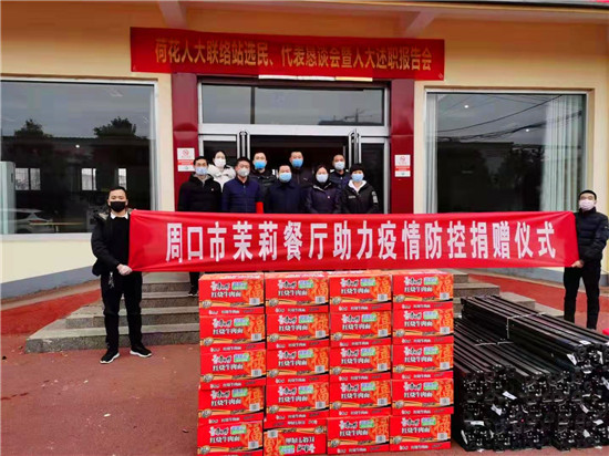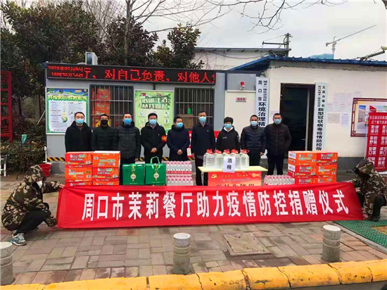 2月5日、6日,茉莉餐厅心系周口防控一线人员,向各办事处防控点捐赠酒精、帐篷等防疫物品,矿泉水、方便面、牛奶等食品助力坚守在防控一线的工作人员,共克疫情。