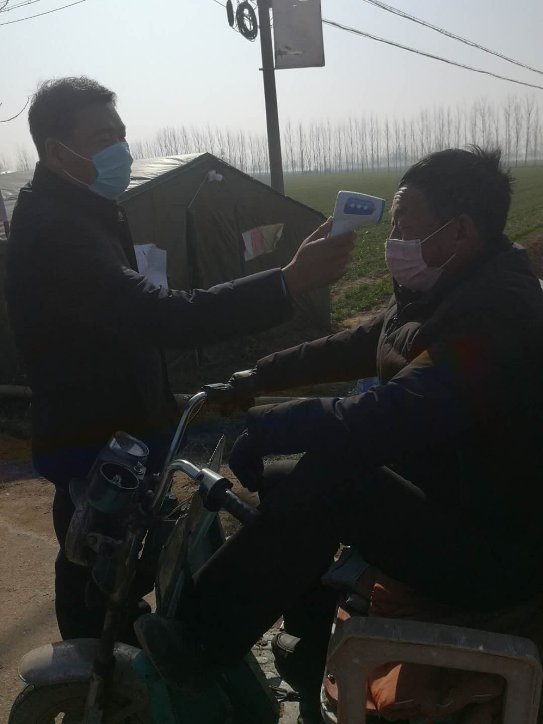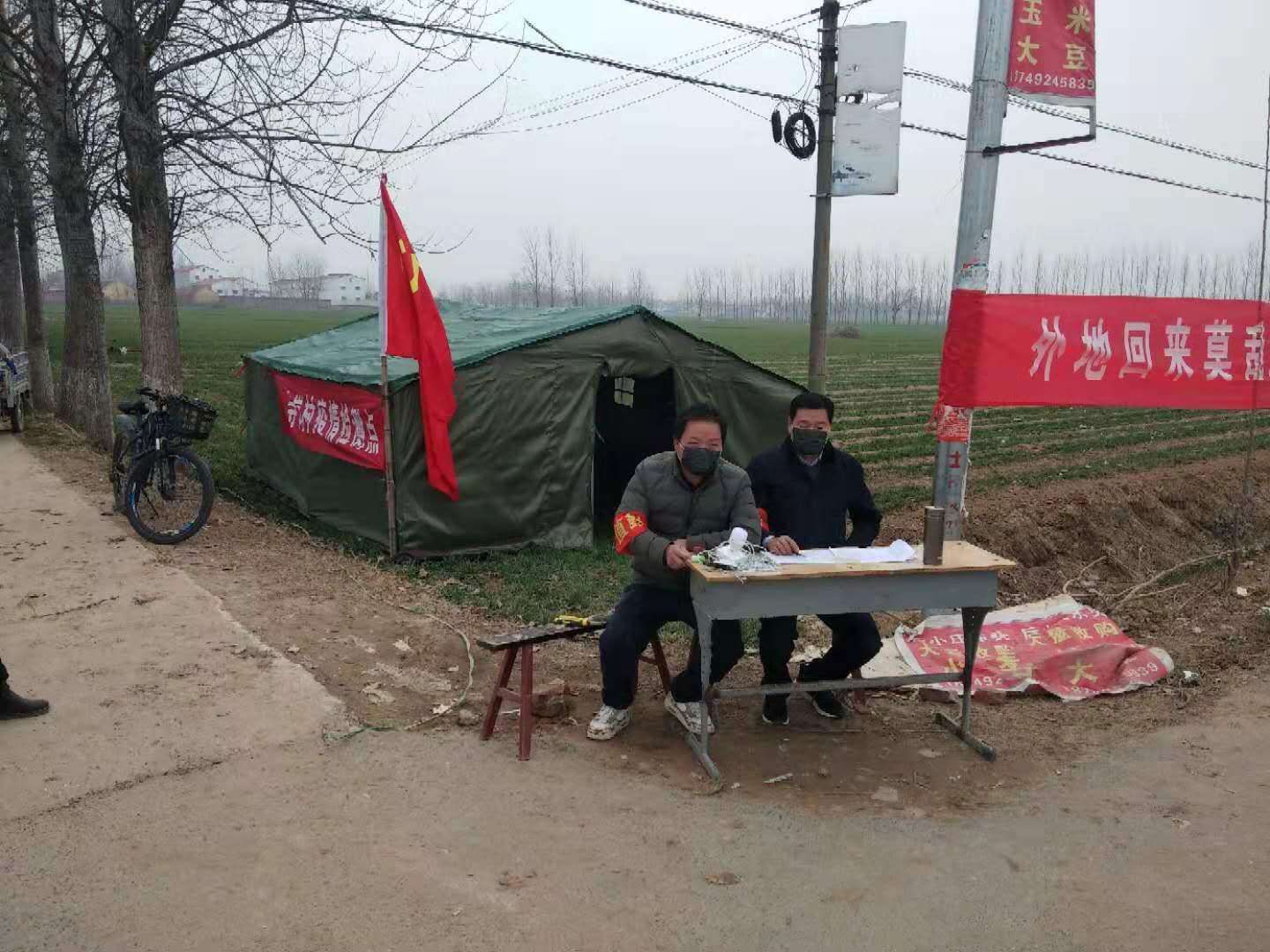 由于物资未曾到位,检测点仅简单搭了一顶四面透风的帐篷,纪占东跟其他工作人员一起在寒风中检查登记出入人员、测量体温,天气寒冷,吃饭也只能用馒头、泡面对付,但是内心是火热的。纪占东说在防控工作中,绝大部分群众理解和支持的,有群众在家里烧好开水给值班人员送,还有的群众送来暖手宝、热气腾腾的饭菜......这些都是他工作的动力和源泉。