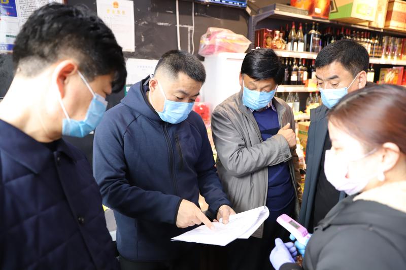 在幸福家园小区门前的一处超市,孙红伟查看超市对进店顾客登记薄,向超市老板了解店里采取的防控措施。孙红伟告诉商户,为了阻止疫情传播扩散,商户要严格按照防控要求,对到店顾客进行登记、测量体温。