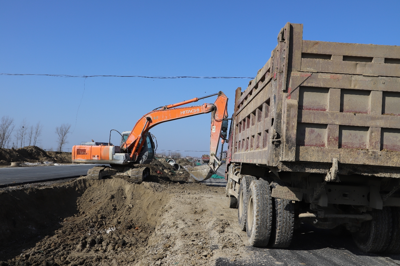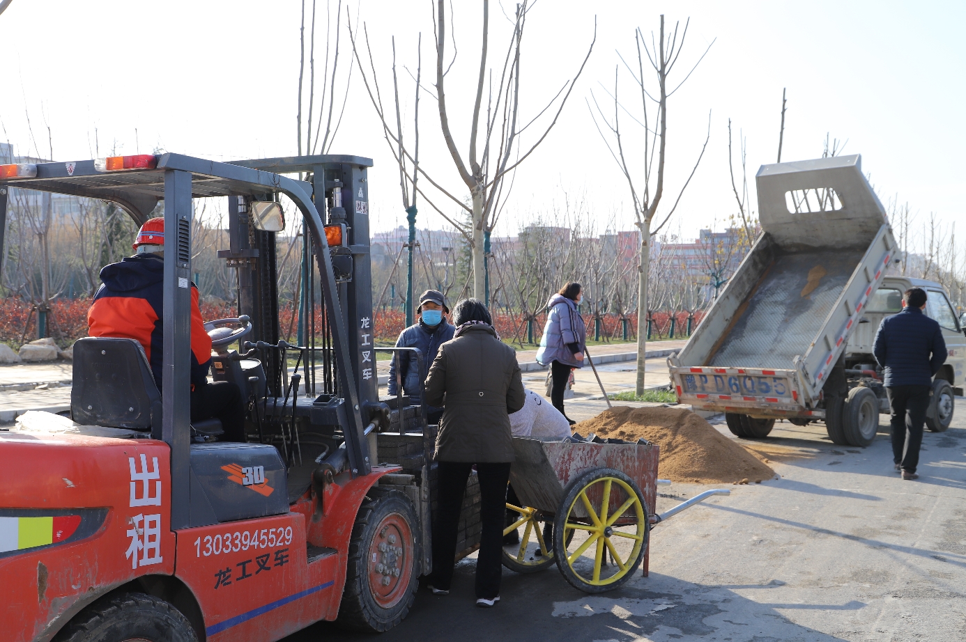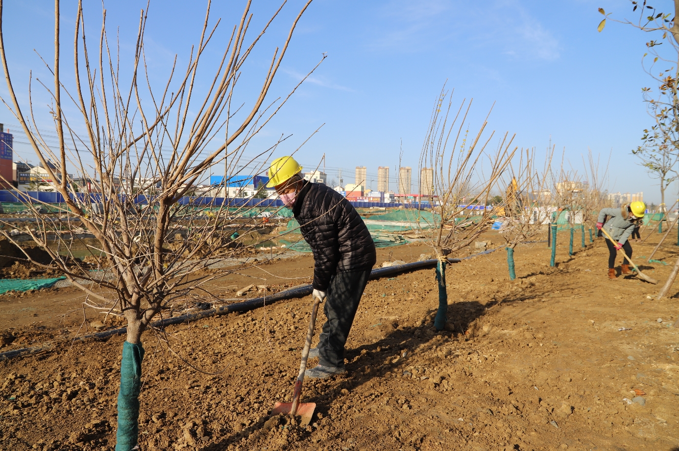远远望去,10多辆渣土车、挖掘机轰鸣,有序地转移着“土山”、平整着绿化带、疏浚着护路沟……配合机械作业的工人均戴着口罩,工人与工人之间保持着一定距离,施工稳步进行。