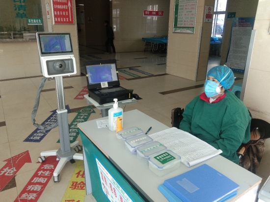 2月18日,记者在周口市中心医院急诊科看到,一台医用红外热像仪出现在急诊科的大门口,前来就诊的患者必须通过该热像仪的检测才能进入急诊科就诊。“前来就诊的患者只需要在热像仪前经过,热像仪就会在屏幕上自动显示患者的体温信息,一旦出现体温偏高的人,热像仪就会自动报警,并不需要人工检测,提高了检测效率。”在该热像仪前做纪录的医务工作者说。 记者 张洪涛 摄