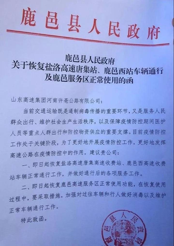 二、即日起恢复鹿邑高速服务区正常使用功能,在恢复使用过程中,要采取措施,加强对过往车辆和行人做好消毒以及维护正常车辆通行工作。