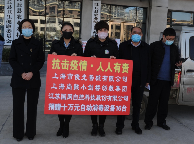 2月18日,在沈丘县疫情防控指挥部,上海市俊光管桩有限公司、江苏国网自控科技股份公司、上海上懿小剑桥教育管理有限公司联合捐赠价值10万元的自动消毒设备16套,沈丘县洲业车业有限公司(洲业国际汽车城)捐赠84消毒液(10升/桶)17桶、(5升/桶)166桶,沈丘县华顺农业建设工程有限公司捐赠75%酒精消毒液(非医用)(2.5L/桶x6/件)168件、一次性使用医用橡胶检查手套(100副/盒)53盒,用于疫情防控工作。县委常委、县政府党组成员马伟,县政协副主席、县工商联主席张瑛,县政府办副主任韩向立出席捐赠仪式。