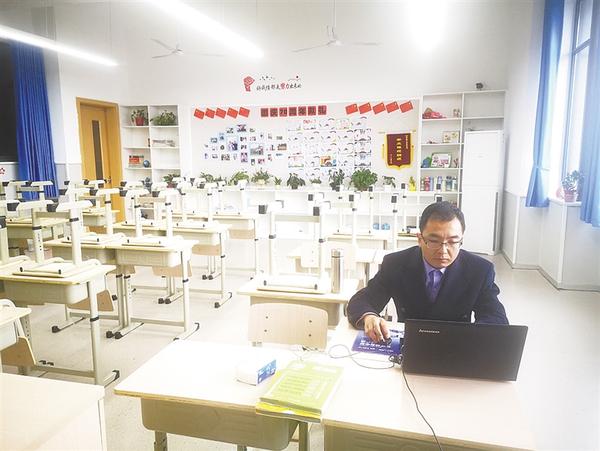 为做好复课准备,周口天立学校外地教师提前回校,进行校内14天隔离。图为该校教师在校内给学生上网课。