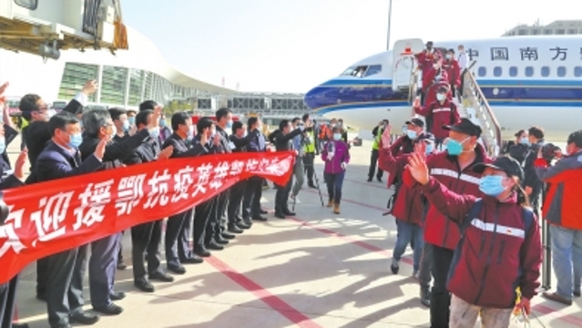 3月30日上午,湖北武汉,《歌唱祖国》响彻云霄。郸城县援鄂抗疫的5名医护队员随河南医护队一道,完成使命、起程凯旋,今天下午到周口。
