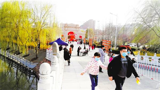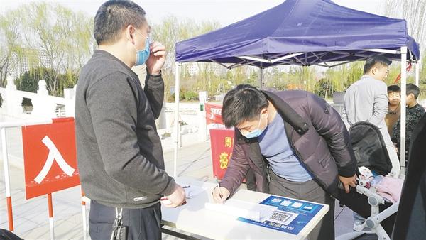 本报讯 3月10日,天气晴朗,暖意融融,关闭一个多月的周口公园开园迎客第二天,记者在周口公园看到,游客都戴着口罩,经登记、测温后依次入园,园内秩序井然。
