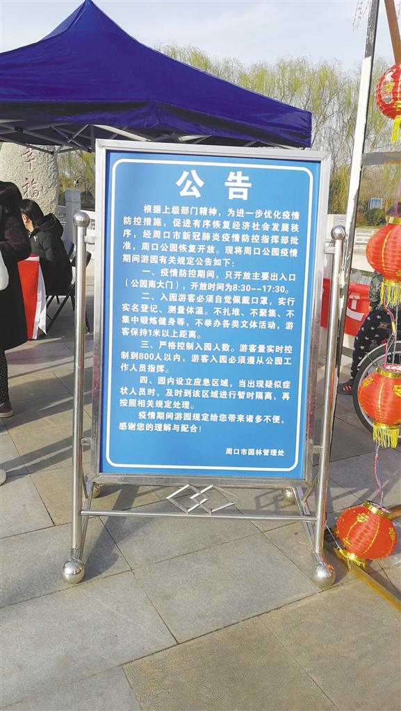据了解,新冠肺炎疫情防控期间,周口公园开放时间较以前有所变动,目前只开放公园南大门。另外还需特别注意,游客入园时必须自觉佩戴口罩,不扎堆、不聚集,当前,园内禁止举办各类文体活动。