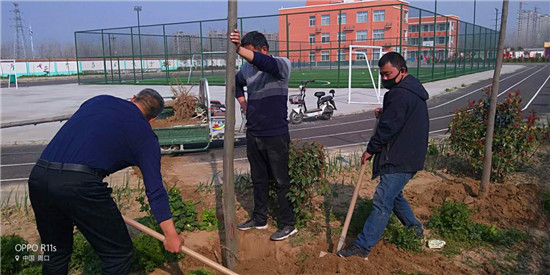 在学校老师的努力下,在蒋庄村干部群众支持下,经过10多天的辛勤劳动,蒋庄小学今年新栽植绿化树、花木5000多棵(株),本来绿色盎然的校园又添新绿。