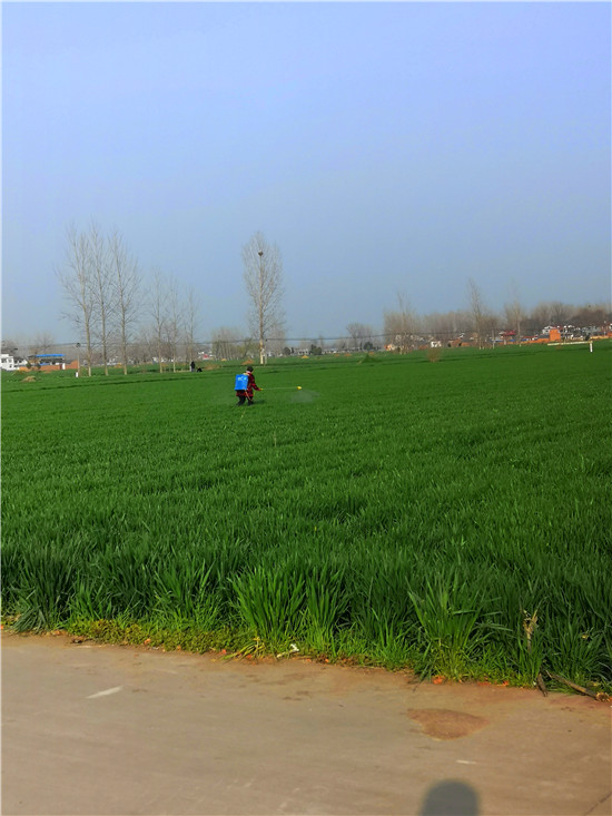 3月10日,沈丘县老城镇南关村村民在麦田里喷洒除草剂。