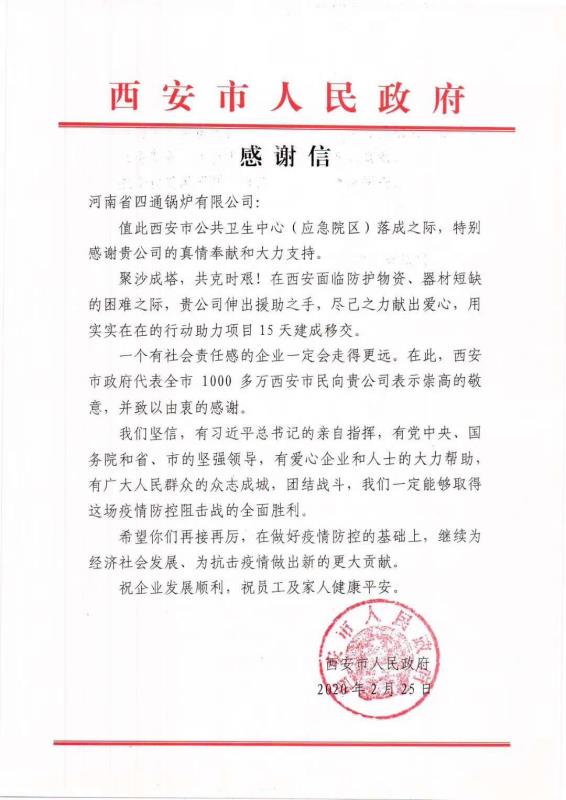 “聚沙成塔,共克时艰!在西安面临防护物资、器材短缺的困难之际,贵公司伸出援助之手,尽己之力献出爱心,在此西安市政府代表全市1000多万西安市民向贵公司表示由衷的感谢”。这是西安市政府对太康县拔尖人才、河南省四通锅炉有限公司总经理冯坤的感谢信。一方有难,八方支援。在新闻上了解到武汉新冠肺炎疫情突发的情况后,他连夜与中国红十字会和武汉红十字会取得联系,询问向新建的火神山医院捐赠医用锅炉和捐款事宜,通过网上银行将30万善款转入武汉红十字会账户中。