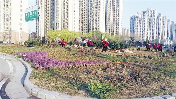 3月18日早晨,中心城区周口大道桥北街心花园内,工人们正在种植花草。近日天气持续晴好,正是种植花草树木的大好时节。记者 关秋丽 摄