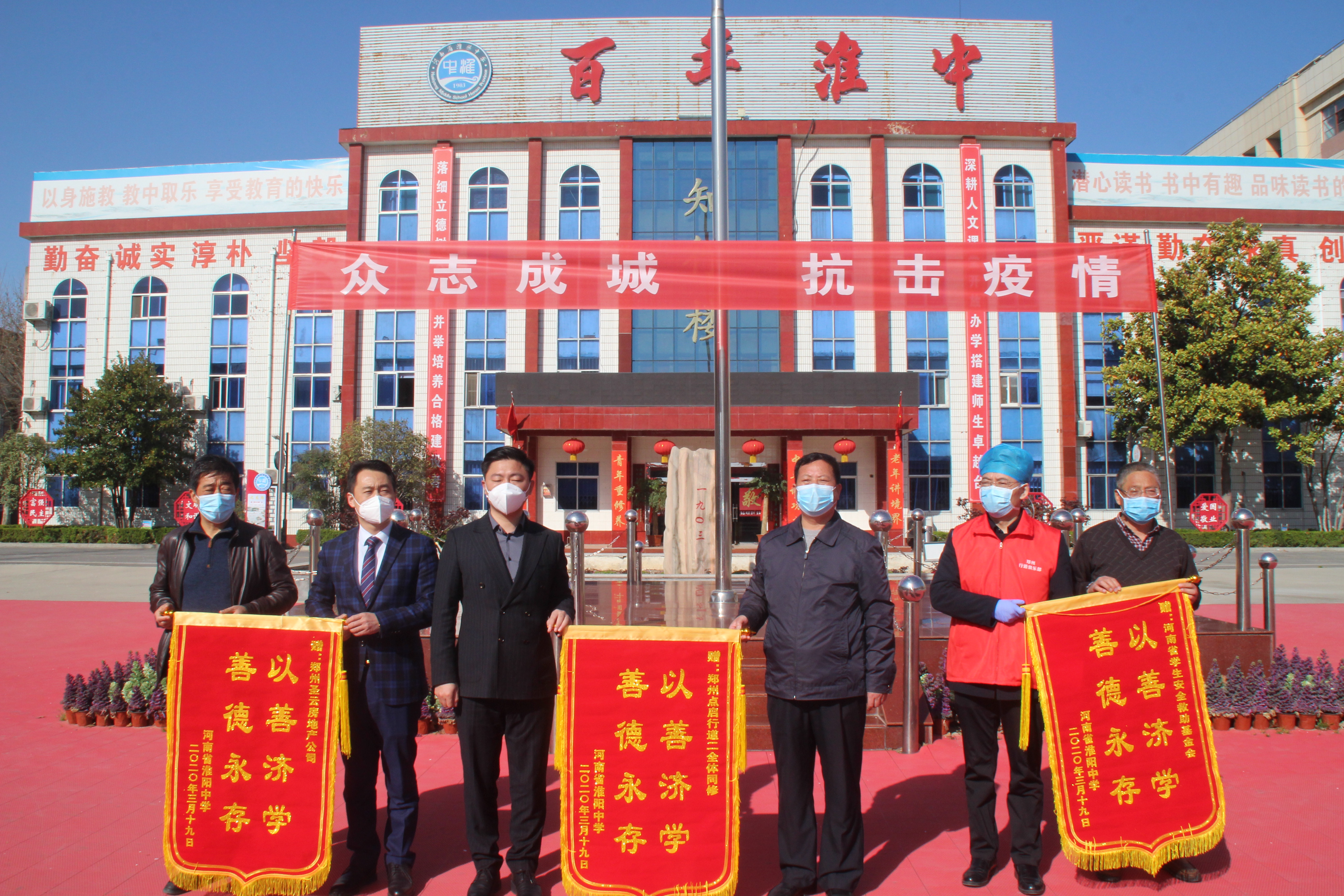 当天,校长高远征主持捐赠仪式。 淮阳区教体局局长师建峰在致辞中说,疫魔无情,人间有爱。在全国上下抗击新冠肺炎疫情的关键时刻,河南省学生安全救助基金会、郑州点启行道二全体同学、郑州胜云房地产公司等爱心人士伸出援助之手,捐赠物资支援淮阳中学疫情防控工作,充分彰显了强烈的社会责任担当和奉献精神,令人感激和敬佩。抗疫物资给淮阳中学带来了战“疫”的暖心和信心,为淮阳中学疫情防控工作增添了力量。