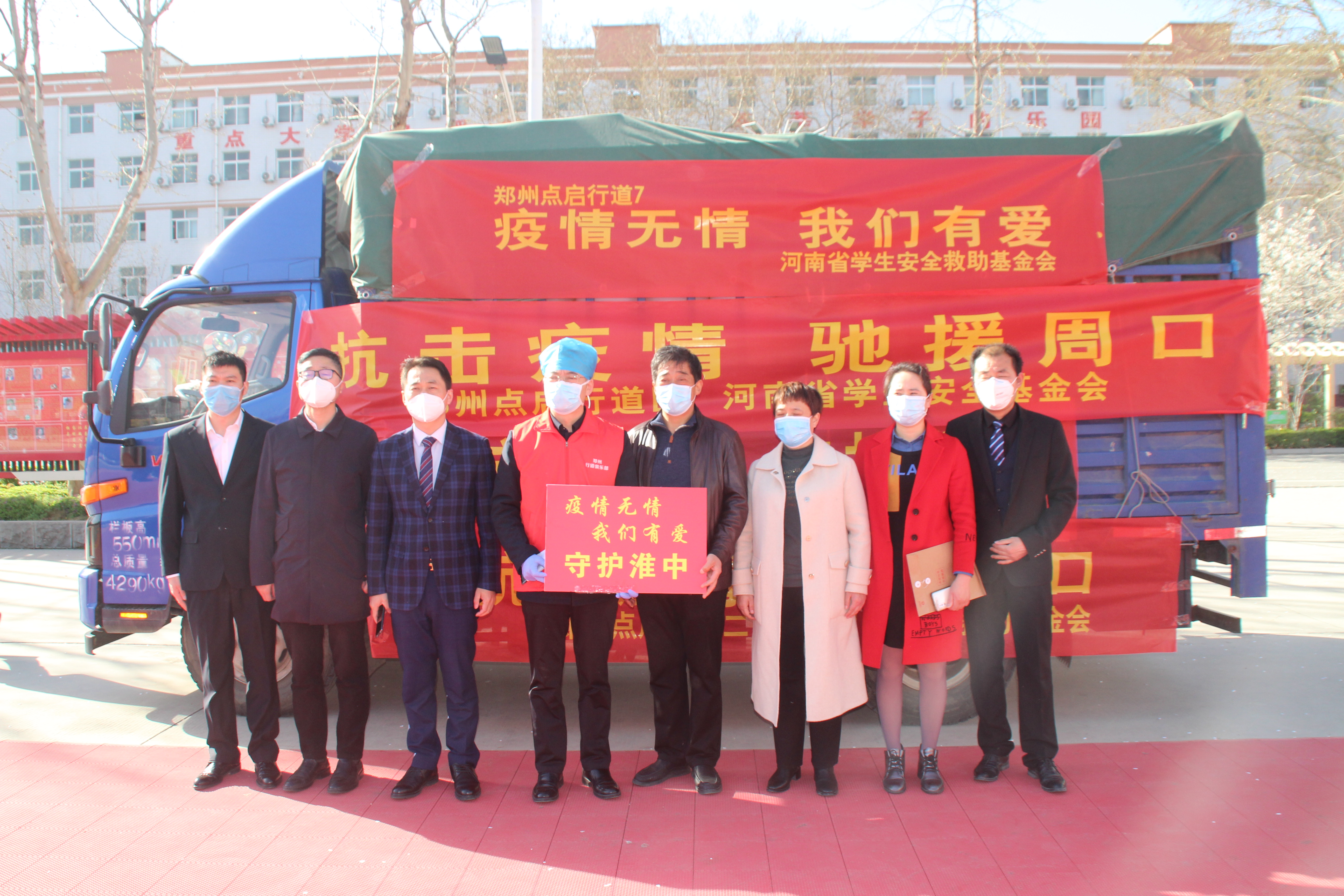 3月19日,河南省学生安全救助基金会、郑州点启行道二、郑州胜云房地产公司等爱心团体向淮阳中学捐赠酒精200桶、84消毒液100桶,总计3.5吨抗疫物资。