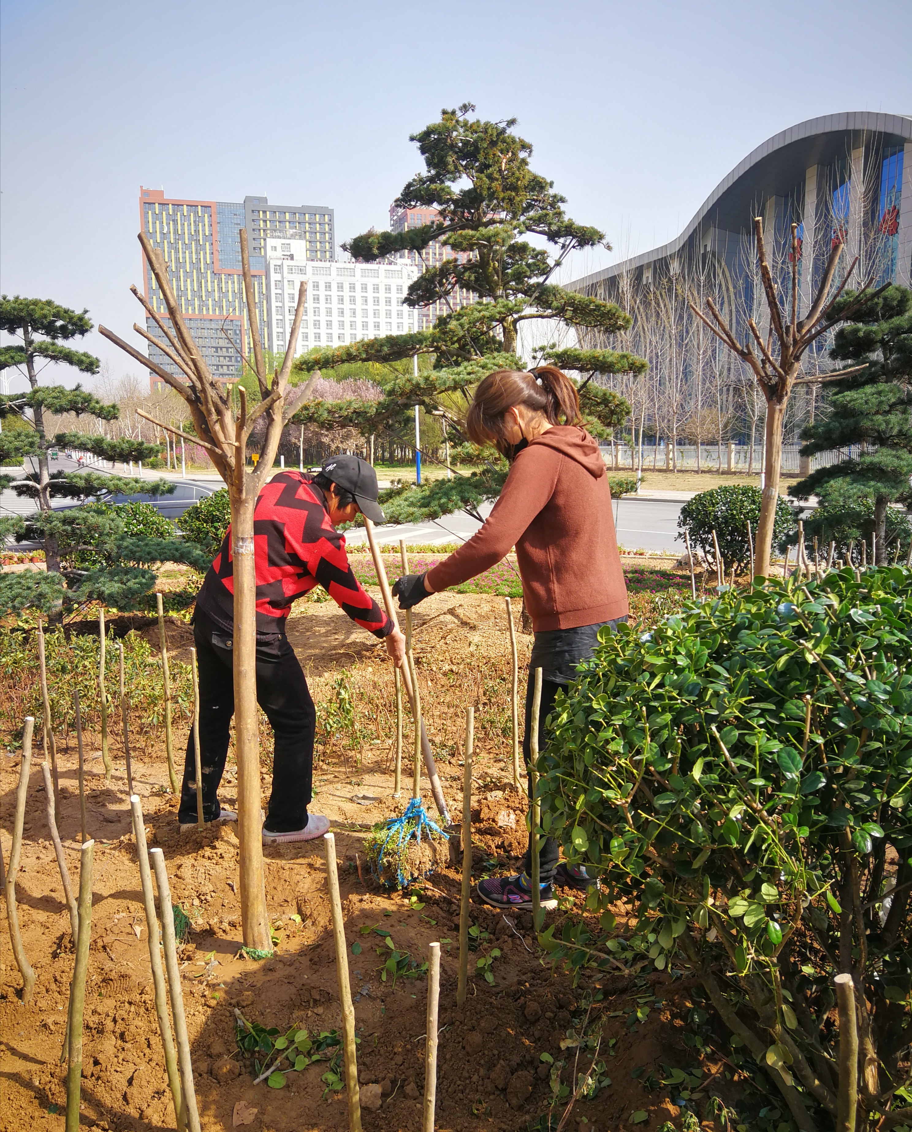 3月20日,中心城区周口大道桥北街心花园内,绿化正人们正在忙碌着。