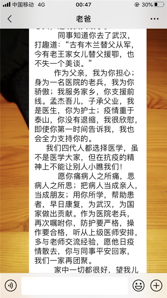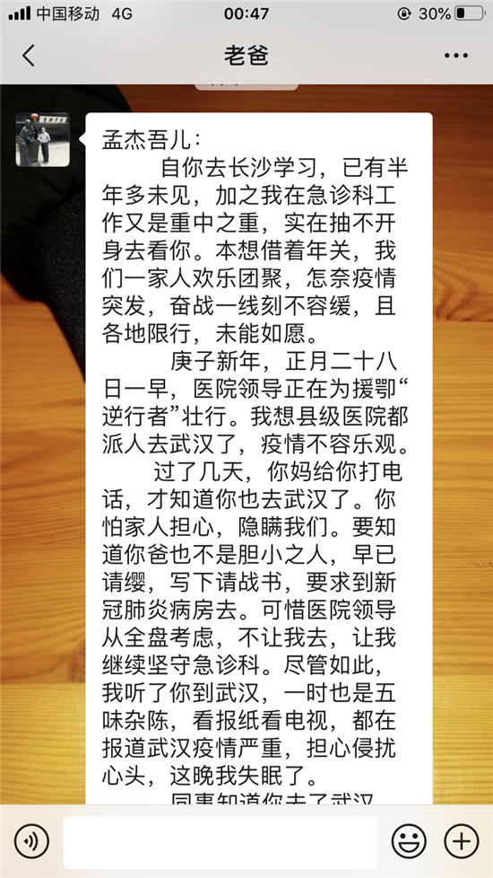作为父亲,我为你担心;身为一名医院的老兵,我为你骄傲;我服务家乡,你支援前线。孟杰吾儿,子承父业,我是医生,你为护士;疫情重于泰山,你没有退缩,我很欣慰,即使你第一时间告诉我,我也会全力支持你的。