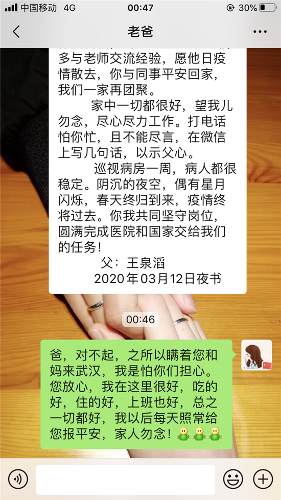 3月21日,周口援鄂医疗队出征满一月。当晚,王泉滔通过微信又郑重给女儿说下这番话:一晃你在武汉一个月了,我和家人从你去武汉的担心到现在的放心,这是国家给予我们的安心。农民把地种好,教师把学教好,士兵把国门守好,医护把病治好,都是自己的使命,更是自己的初心。人人怀揣私字,社会必败,遭殃的终归众人;众人心怀天下,万物皆胜,受益的定是人人。看到河南部分援鄂医疗队从武汉凯旋归来,虽然没有你的身影,但是我们很高兴,说明武汉的疫情已得到控制,我和家人一起期盼你早日归来。但是还是要再次叮嘱你,不要因为疫情到了最后而放松警惕,上下班路上注意安全,穿脱防护服不能有一丝懈怠,时刻保持警醒。年前你当了姑姑,虽然还没有见到你侄子,但他和家人共同期待你平安回来。吾儿加油!